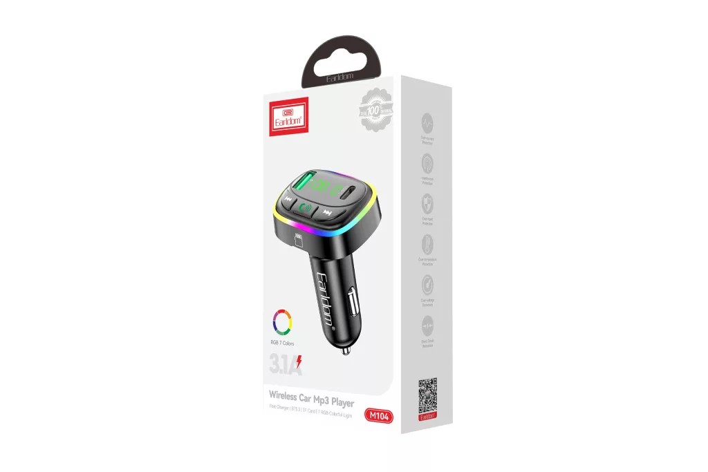 Az Earldom ET-M104 egy fekete színű, dupla portos (USB-A/Type-C) autós töltő és FM Transmitter. A szivargyújtóba helyezhető eszköz lehetővé teszi a zenelejátszást a telefonról Bluetooth-on keresztül az autórádión. Támogatja a kihangosított hívásokat is. Két töltési porttal rendelkezik (USB és Type-C), amelyek gyorstöltést is támogathatnak (pontos specifikáció hiányában feltételezve). Ideális választás azoknak, akik egy kényelmes, sokoldalú eszközt keresnek töltéshez, zenehallgatáshoz és híváskezeléshez utazás közben. Ugyanaz a funkcionalitás, mint az ET-M103-nál, valószínűleg eltérő dizájn.
