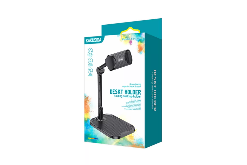 A Kakusiga KSC-747 asztali tartó a rugalmasság és a stabilitás mintaképe a fekete színű kiegészítők között. A tartókar több ponton is csuklós kialakítást kapott ami lehetővé teszi a tablet vagy telefon magasságának és szögének precíz finomhangolását. Ez különösen fontos a nyak és a váll terhelésének csökkentése érdekében hosszú távú használat során mint például online oktatás vagy sorozatnézés közben. A készüléket tartó bölcső szilikon betétekkel van ellátva amelyek megóvják az eszközt a csúszástól és a karcolásoktól. A nehezített talp biztosítja az alacsony súlypontot így a tartó még gépelés vagy érintés közben is stabil marad a felületen. A kábelvezető kialakítás segít a töltőkábelek esztétikus elrendezésében. A tiptok webáruház terméke tartós anyagokból készült biztosítva a hosszú távú megbízhatóságot otthoni vagy irodai környezetben egyaránt.