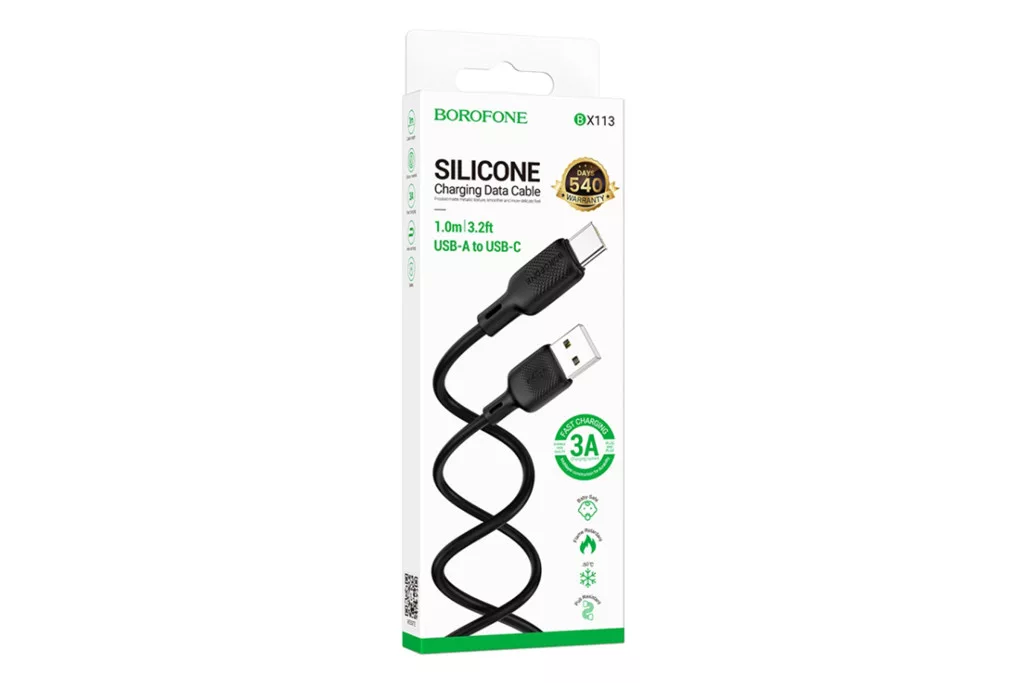 A BOROFONE BX113 USB Type-C Töltőkábel a modern eszközök gyors töltéséhez készült. 1 méter hosszúságával és 3A-es áramerősségével (feltételezve) ideális a Type-C csatlakozós telefonok, tabletek és más eszközök gyorstöltéséhez és adatátviteléhez. A fekete, tartós anyagból (pl. szilikon/TPE) készült kábel ellenáll a mindennapi igénybevételnek, és hosszú élettartamot garantál. Az optimális hosszúság (1m) kényelmes használatot tesz lehetővé. Kulcsszavak: BOROFONE BX113, Type-C kábel, töltőkábel, 3A, 1m, gyors töltés, adatkábel, fekete.