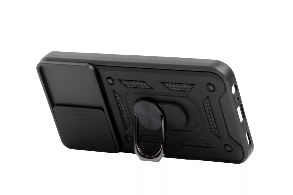 A Samsung Galaxy A17 5G (A176B) Armor ütésálló tok kompromisszumok nélküli védelmet nyújt a fekete szín eleganciájával. A két rétegű hibrid kialakítás, a kemény polikarbonát külső és a rugalmas TPU belső, maximális védelmet biztosít a leejtések, ütések és karcolások ellen. A tok különlegessége a hátoldalon található tolóablak, amely biztonságosan védi a kamera lencséit, elkerülve a karcolódást és a szennyeződést. A tok hátlapjába integrált mágneses gyűrű lehetővé teszi a mágneses autós tartók egyszerű használatát. Emellett a beépített kitámasztó funkció (kickstand) kényelmes médiafogyasztást tesz lehetővé fekvő módban. Ez a fekete Armor tok ideális választás azoknak, akik a legnagyobb védelmet és a praktikus funkciókat keresik a Samsung Galaxy A17 5G készülékükhöz. A precíz kivágások minden funkció zavartalan használatát biztosítják.