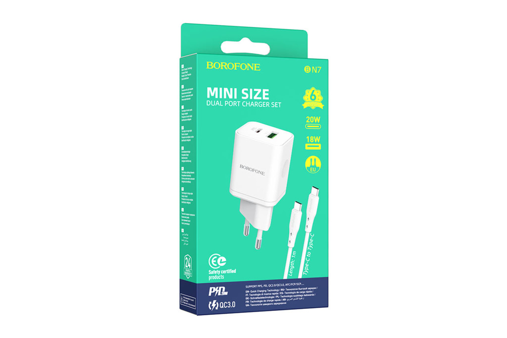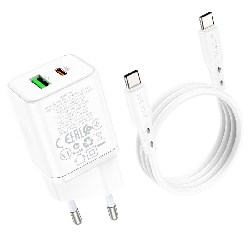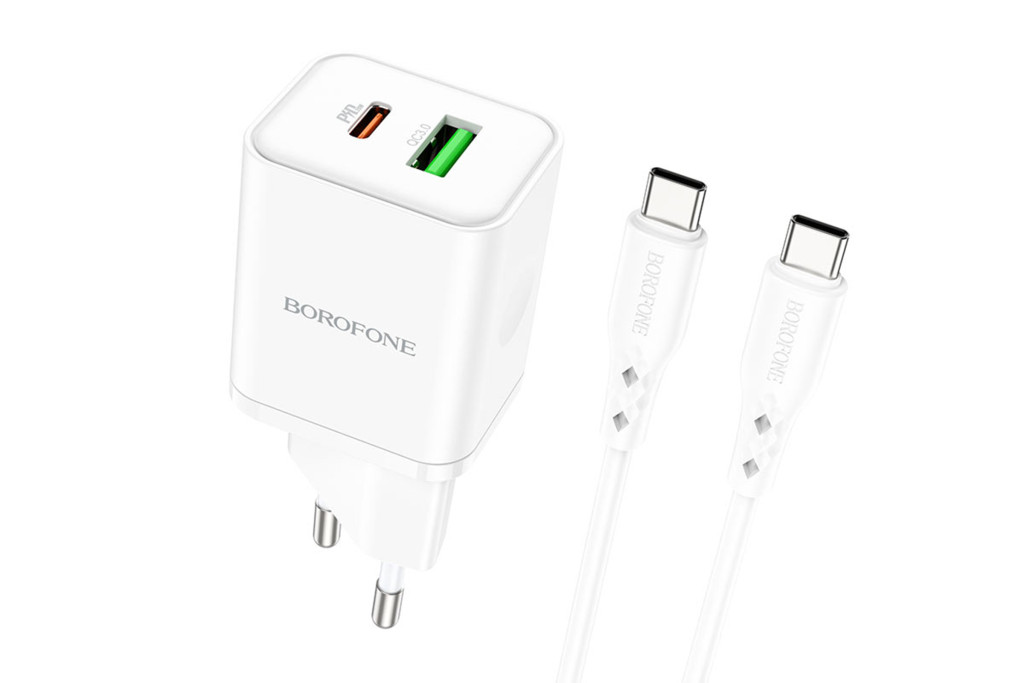 Type-C és USB portos hálózati gyorstöltő (PD)20W+QC3.0 Type-C kábellel Borofone BN7 fehér