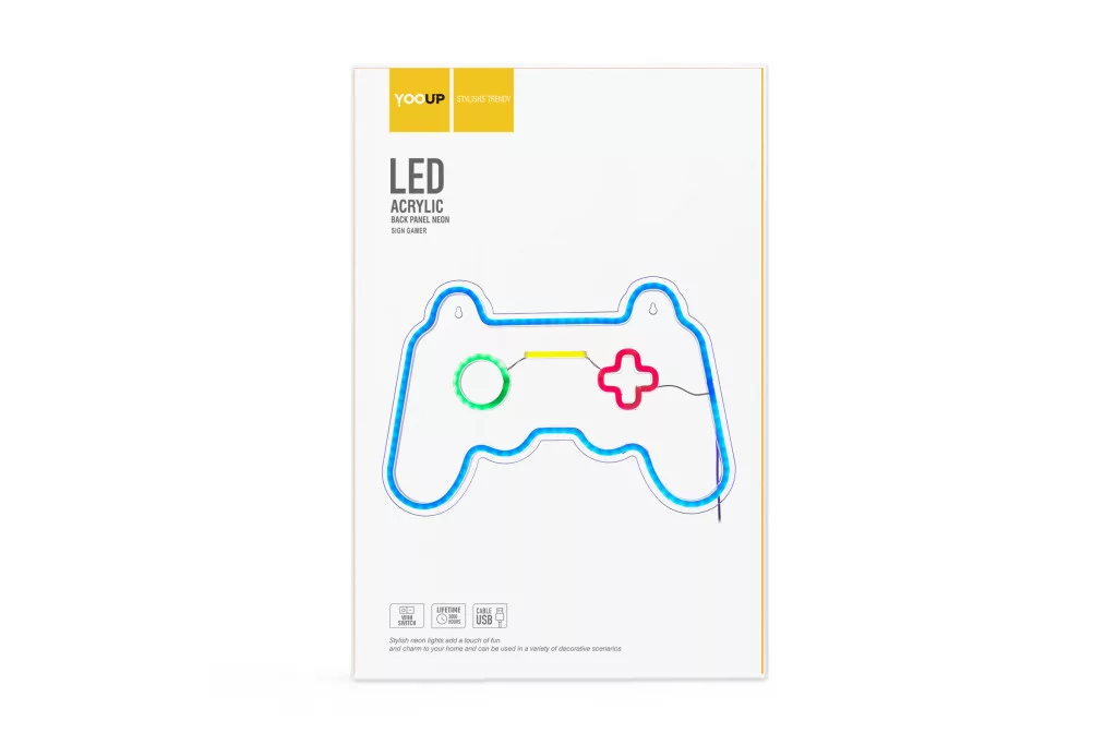 A YOOUP Game Console LED fali neon dekoráció a modern esztétika, a gaming kultúra ikonikus motívumai és a felhasználóbarát technológiai megoldások lenyűgöző ötvözete. A YOOUP márka azon filozófiáját követve, hogy a termékek legyenek egyszerre inspirálóak és rendkívül funkcionálisak, megalkotta ezt az élénk kontrollermotívumot, amely a falon vagány, egyedi és energiával teli hangulatot teremt. Ez a neon kiváló eszköz a tér karakteres, fiatalos és technológiai hangulatának megteremtésére.