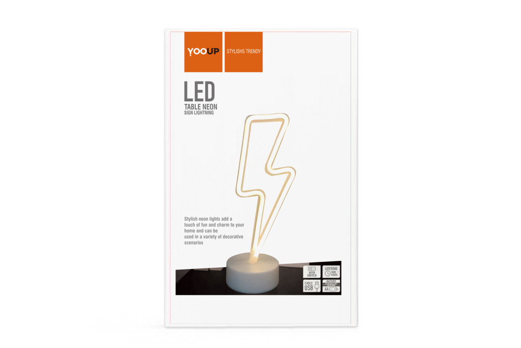 A villám motívum karcsú mérete (11x8.5x29.5 cm) ideális az asztali használatra, minimalista talpazata pedig stabil elhelyezést biztosít. A YOOUP a hagyományos gázneon helyett energiatakarékos és biztonságos LED technológiát alkalmaz, amely hosszú élettartamot és minimális hőtermelést garantál, miközben a fényhatás a klasszikus, élénk neon vizuális erejét adja. A YOOUP Lightning neonnal a sebesség, a stílus és a technikai kényelem találkozik egyetlen, lenyűgöző dekorációs elemben.