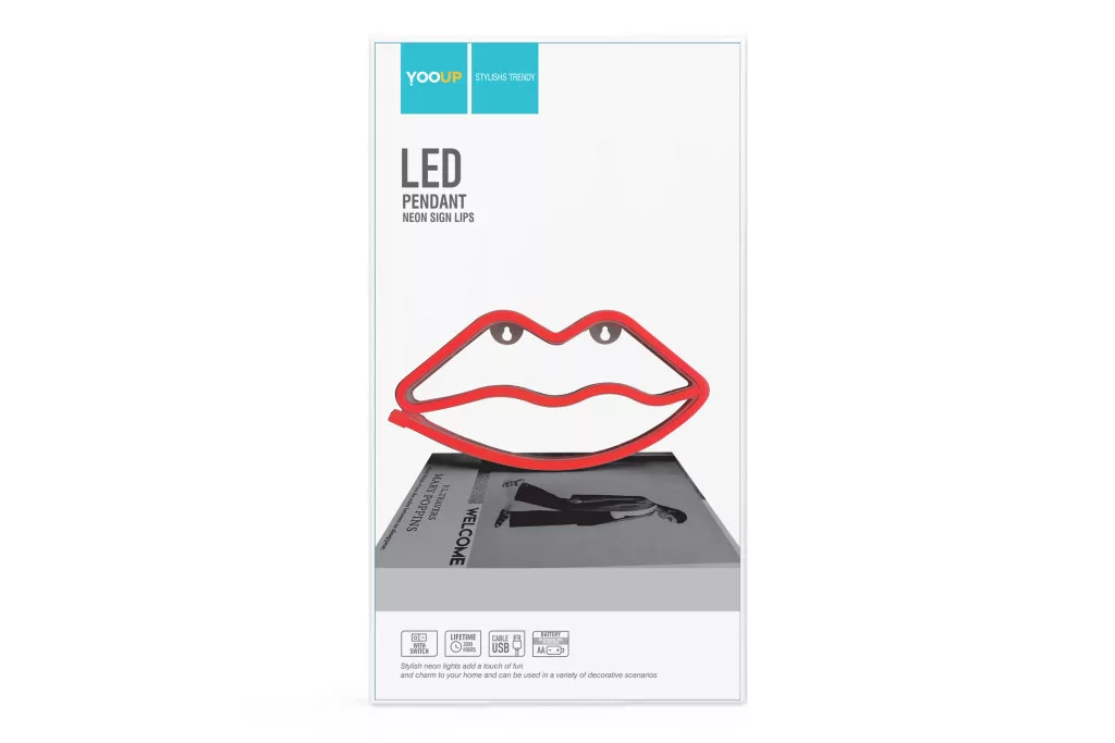 A neon mérete (14x1.5x26.5 cm) és a mindössze 1.5 cm-es mélysége miatt ideális fali használatra, elegánsan simul a felülethez. A YOOUP a hagyományos gázneon helyett energiatakarékos és biztonságos LED technológiát alkalmaz, amely hosszú élettartamot és minimális hőtermelést garantál, miközben a fényhatás a klasszikus, élénk neon vizuális erejét adja. A YOOUP Lips neonnal a szenvedély, a stílus és a technikai kényelem találkozik egyetlen, lenyűgöző dekorációs elemben, amely a faladat a merész, divatos stílusod kifejezőjévé változtatja.